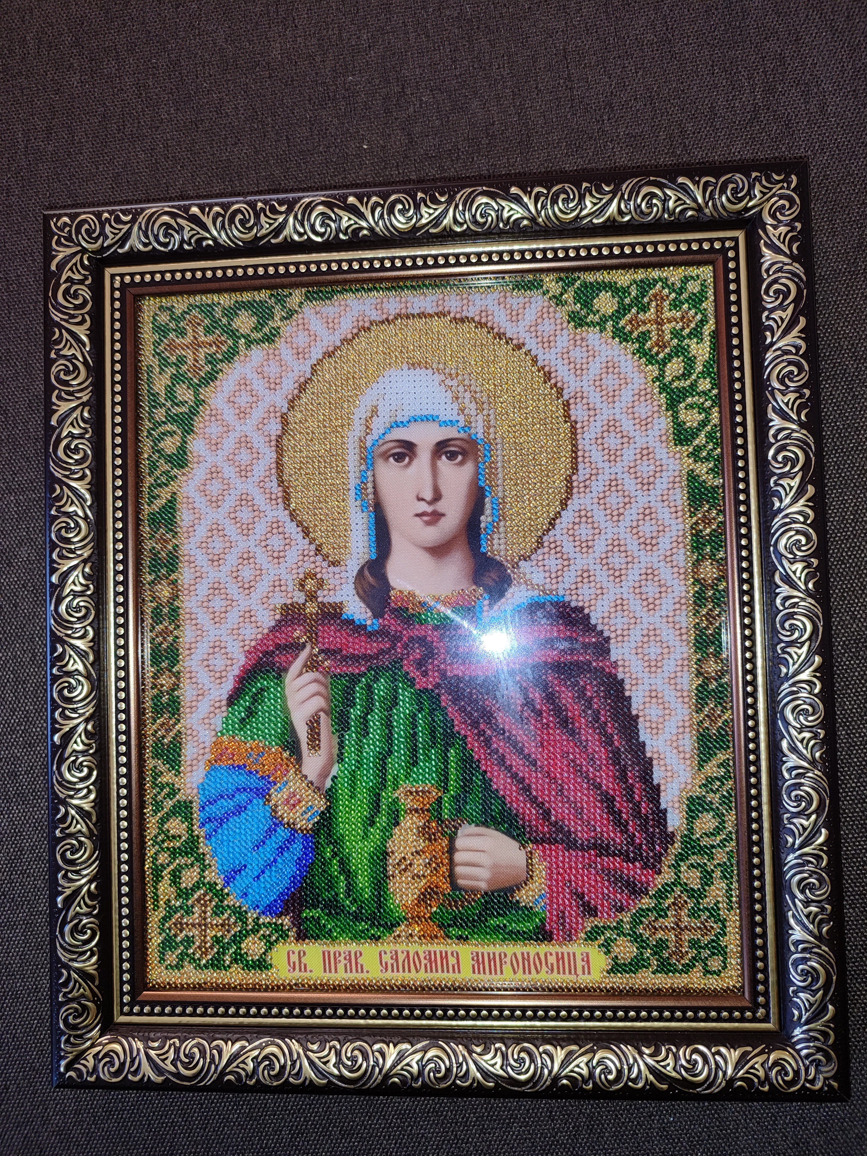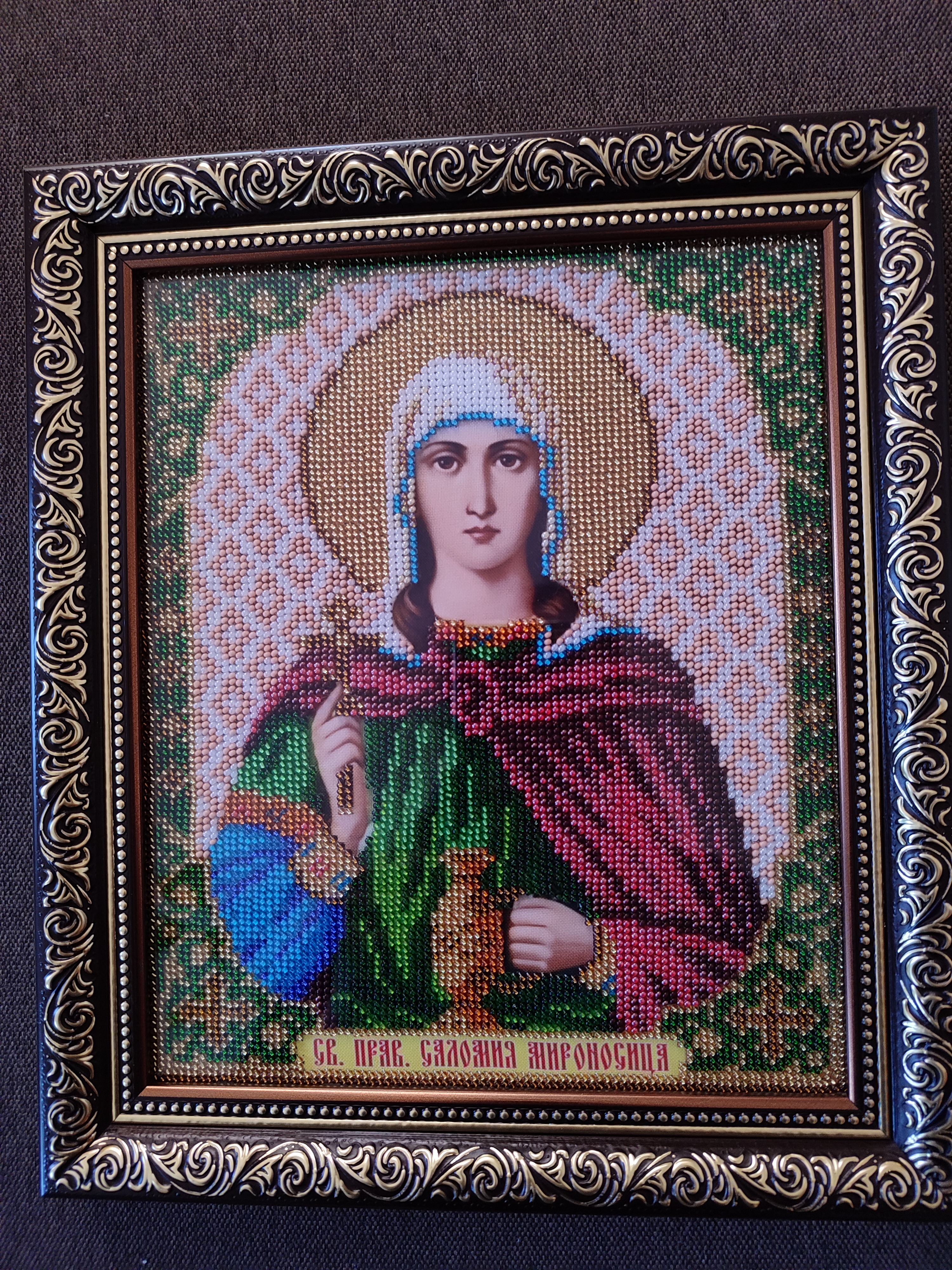 Появилась возможность продажи одной из своих работ, вышитых бисером собственноручно - Именной иконы Святая Соломия. Икона полностью готова и оформлена в красивую рамку в багетной мастерской. Параметры: Высота (с рамкой) -31 см; Ширина (с рамкой) - 26,5 см. Ширина самой рамки - 4,5 см. Хорошее решение для человека, носящего это прекрасное имя (как для себя, так и-в качестве подарка). По цене - 1500 грн. Немного фото ниже: