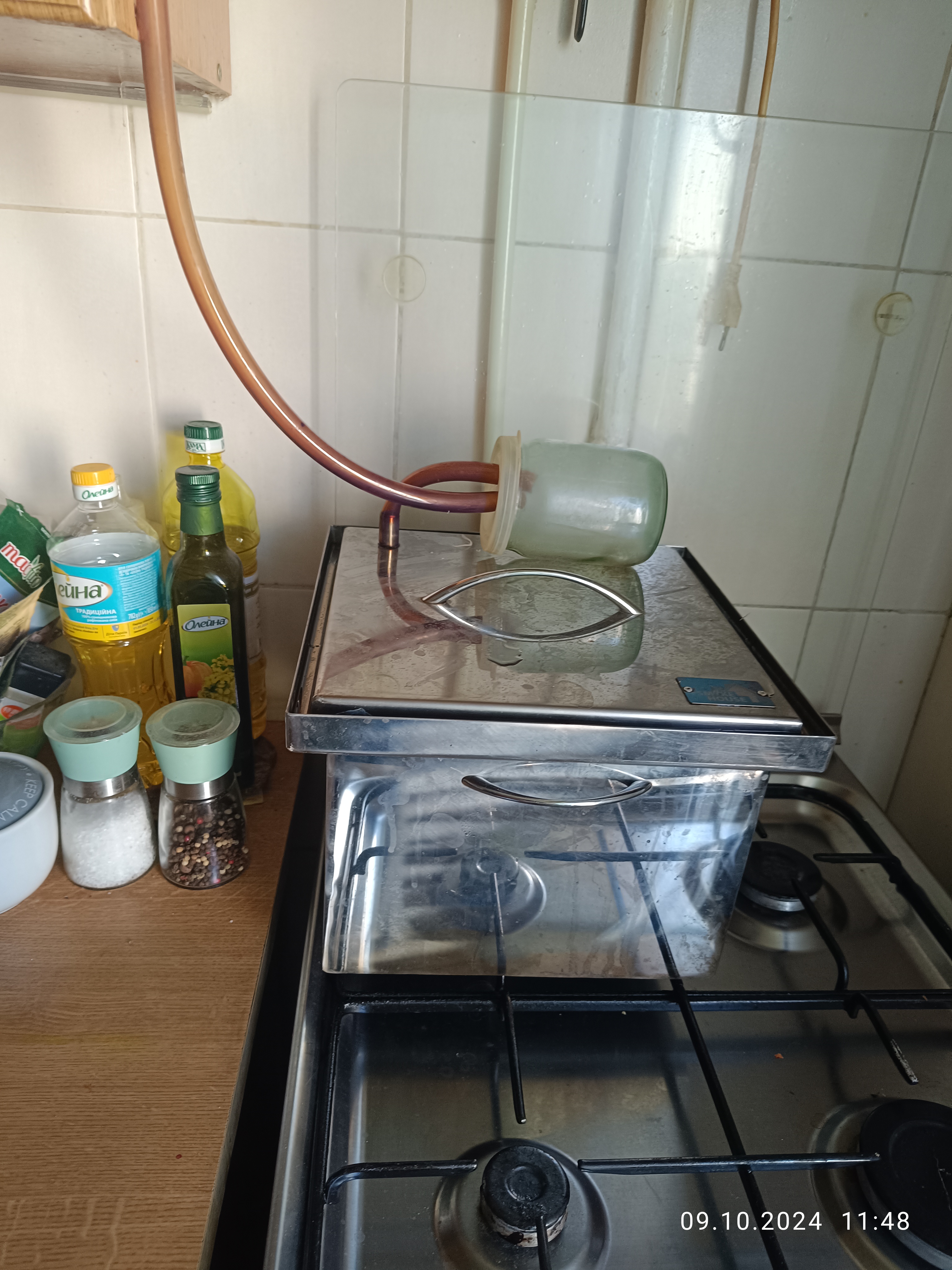 Вообщем эксперимент вроде удался. Пока влага скапливается в банке а дым лишний уходит. По окончанию процесса посмотрю на результат по готовому продукту, но уже есть отличия в поведении коптилки - нет шума испаряющегося капающего конденсата.