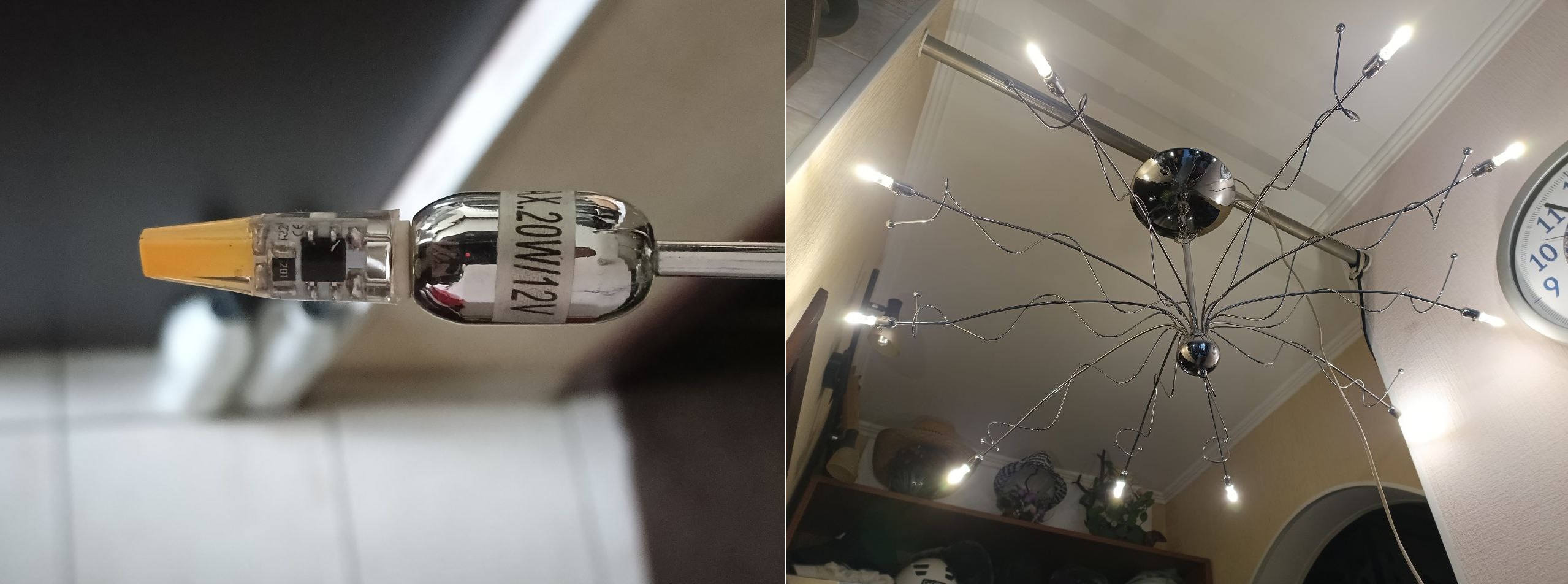 це люстра з аля волосся горгони, раніше була на 12в, але транси погоріли і стала на 220в з галогенами на потужність 300вт, патрони замінити думаю анріал - вони у тонких трубках, думав мінімізувати споживання за рахунок лед, а тут така біда(