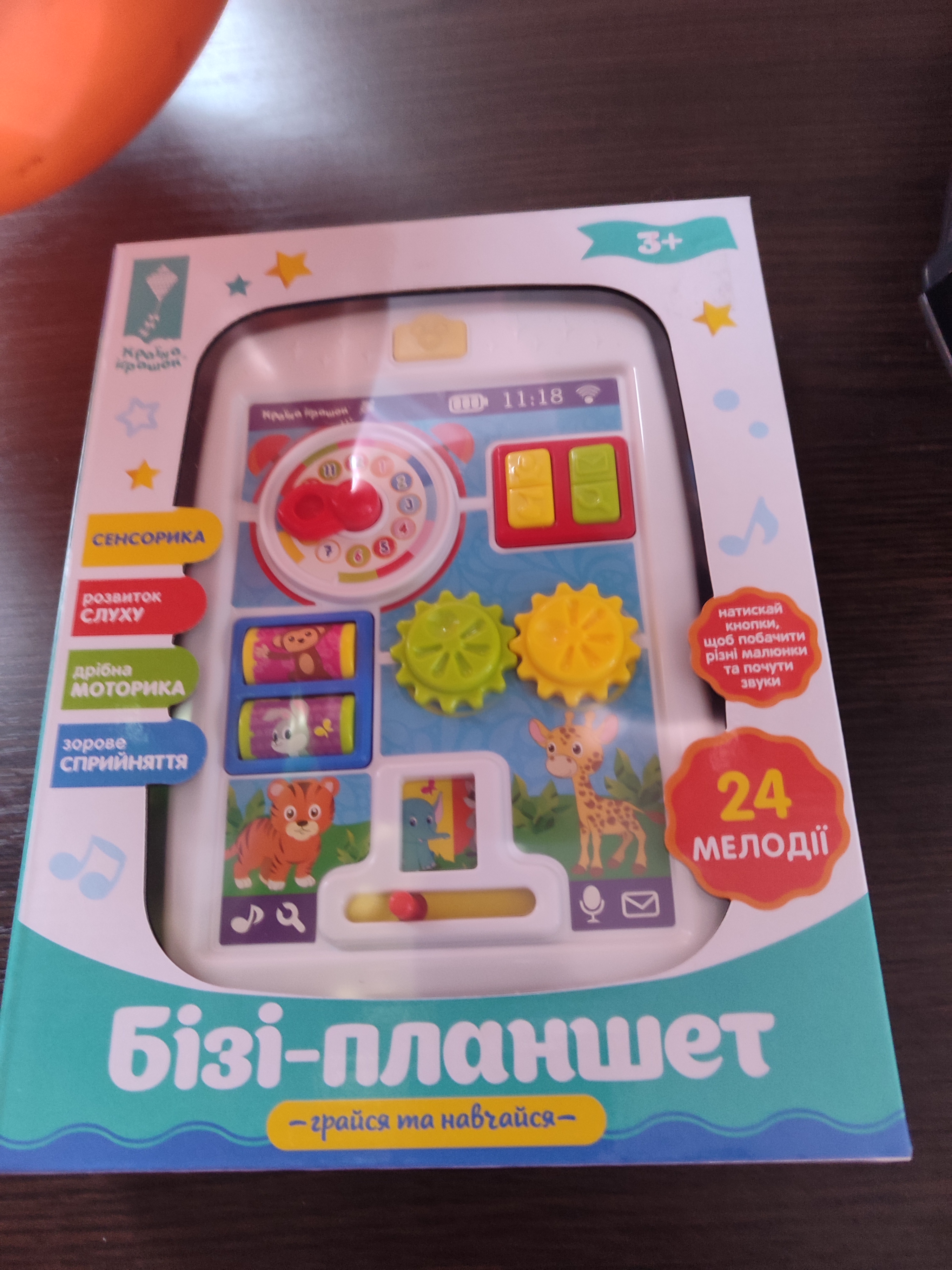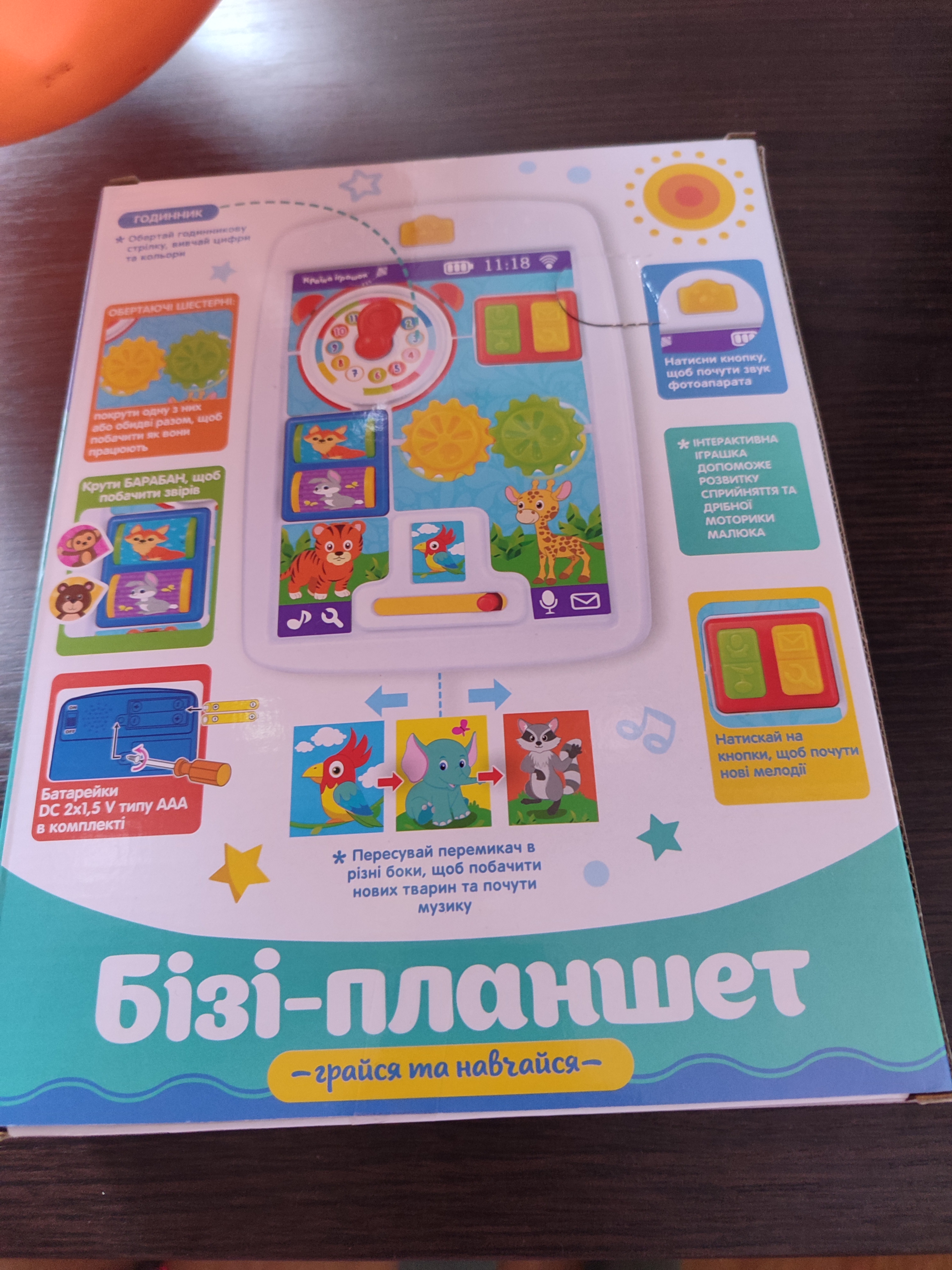 Опис Бізі планшет. Інтерактивна іграшка. Розвиває дрібну моторику, слухову пам'ять, увагу та концентрацію.