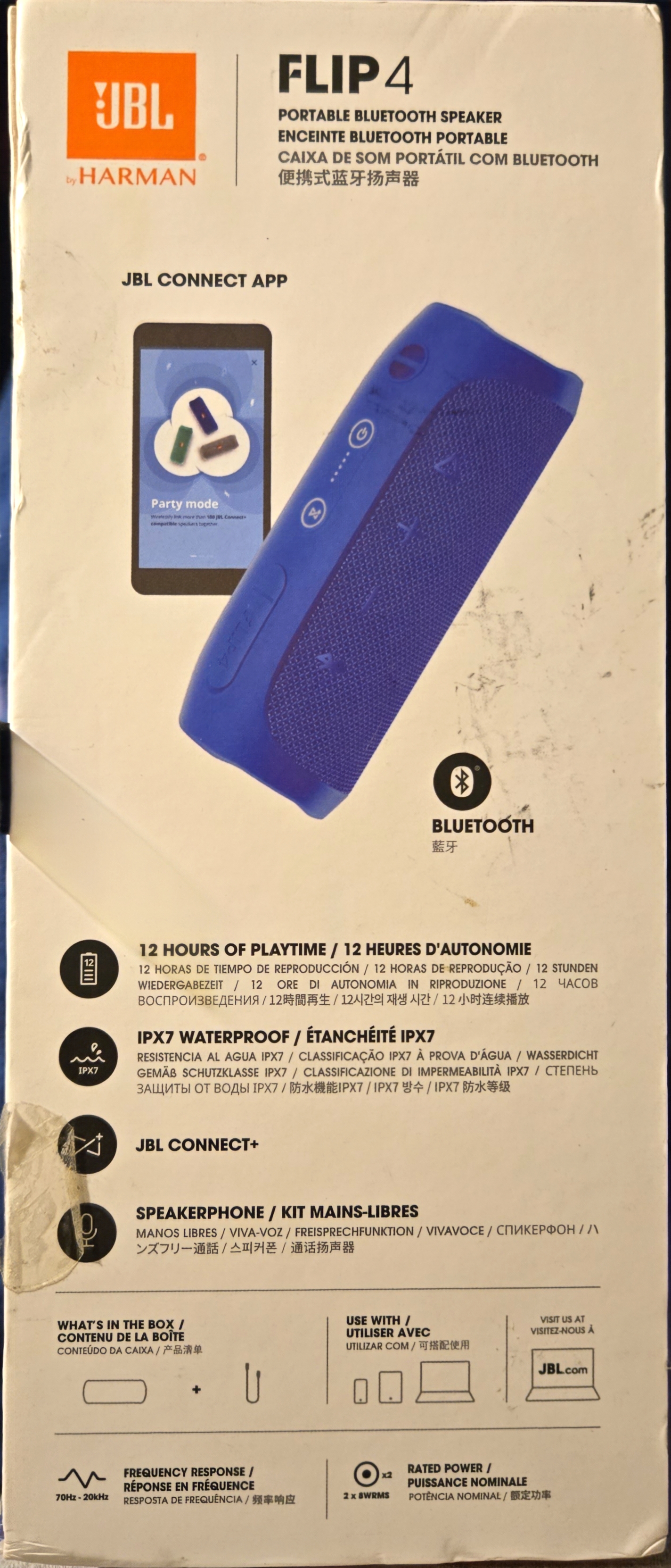 Характеристика: •Батарея: 5000 mAh (+- 12 год час роботи) •Потужність: 20 Вт •Інтерфейс підключення: Bluetooth 4.3, USB, Jack 3.0 •Тип: Об'ємне звучання •Частота: 65 - 20000 Гц •Кількість каналів: 2.0 •Чутливість: 80 дБ •Особливості: Регулювання гучності; Вбудований мікрофон; Водонепроникність; JBL PartyBoost