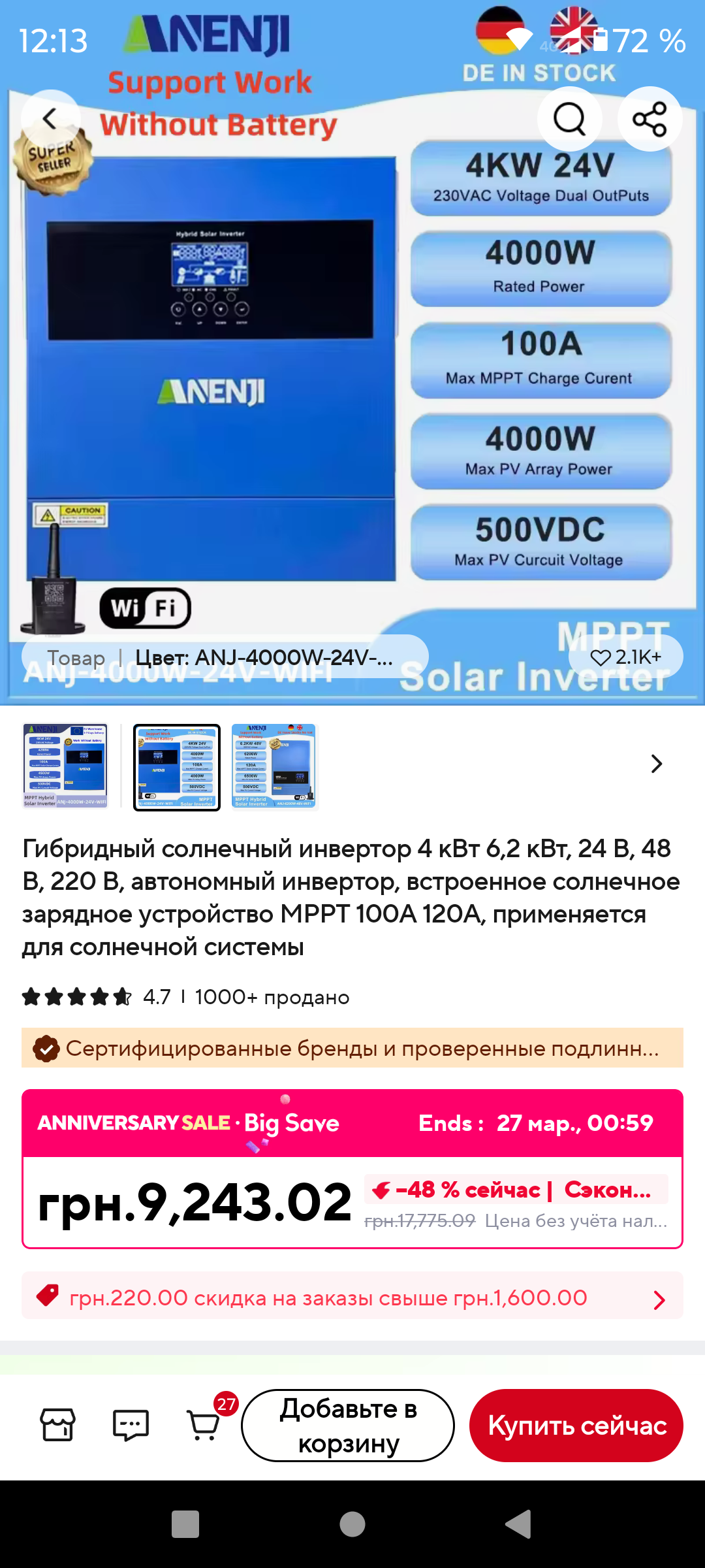 А це вони вже в нас так за ціною просіли що 4 кВт тут і не беруть? Бо я такі 3 інвертори влітку та на початку осені купляв на Алі (точно такі само), то продавались тут із наваром якимось 100+- доларів.