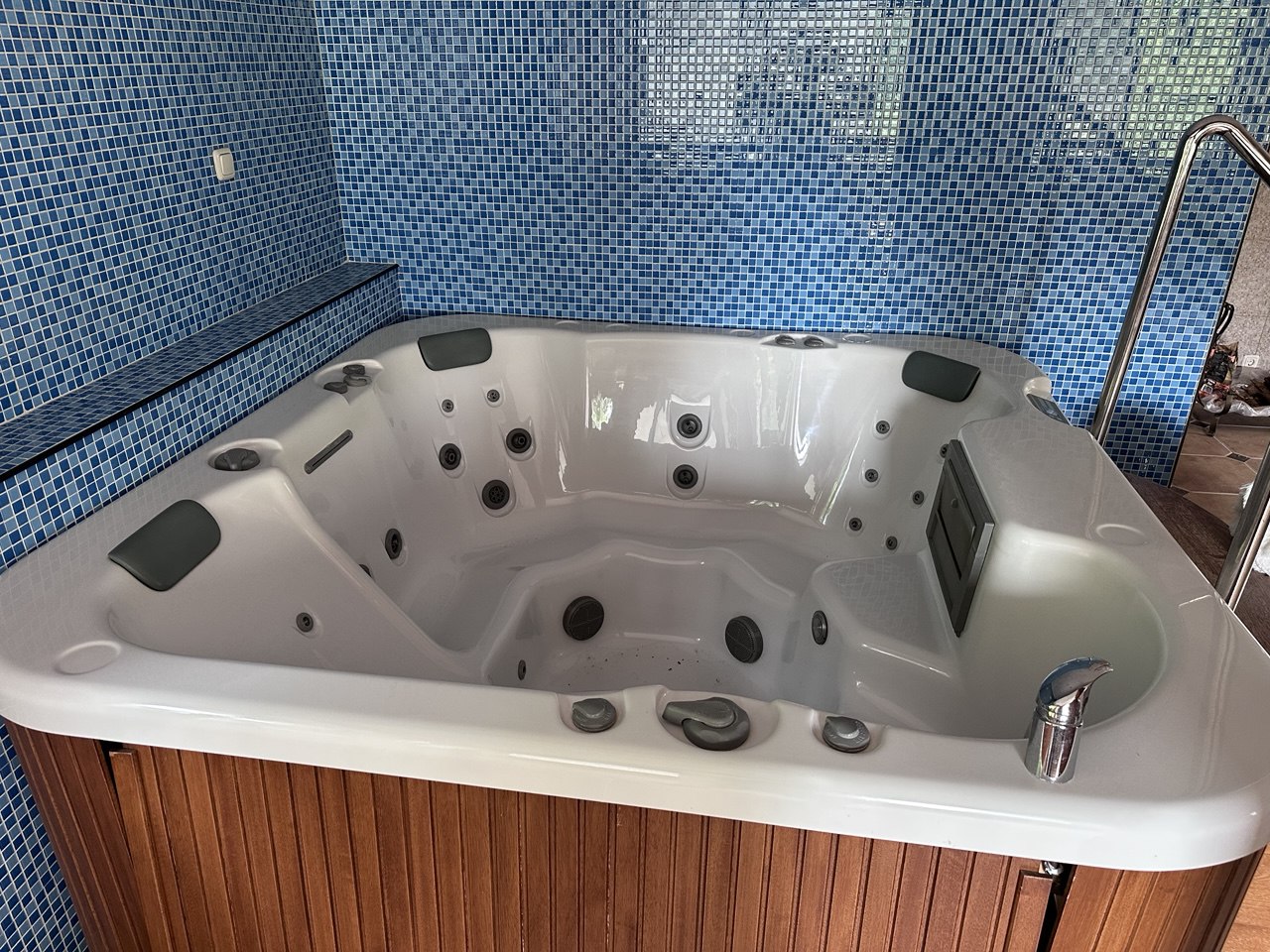 объем - 1100 л вес- 360 кг глубина - 820 мм рассчитан на 5 человек - 4 сидения, 1 лежак материал - гигиенический акрил, армированный полиэфирным ламинатом на алюминиевой раме электронная панель управления всего форсунок - 98 шт. гидромассаж - 25 форсунки мини-форсунки - 17 шт. большие форсунки - 12 шт. форсунка с фиксированным направление - 22 шт. ротационные - 2 шт озонирование - есть УФ-лампа (опция) аэромассаж - 69 форсунок подсветка - белая LED подсветка, разноцветный светодиодный индикатор, многоточечный цветной иллюминатор светодиодного типа телескопический скиммер-фильтр - есть электрический нагреватель 3 кВт или 2х3 кВт система антифриза - есть контроль температуры воды - есть 2х - скоростной водяной массажный насос водяной масажный насос - 1 шт. песочный фильтр - нет напряжение питания - 400 В переменного тока 50 Гц минимальный диаметр электрического кабеля - 5 x 4 мм² сеть - TN - S