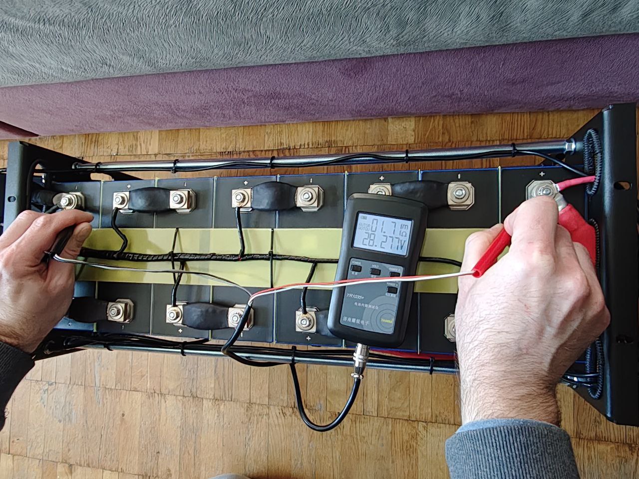 Я "от руки" своей "тарированной" отверткой затягиваю примерно на 4Н*м, но я не хочу потом делать никаких ревизий и что-то там дотягивать, ото мне заняться нечем. Перемычки у меня меднолуженые из кабеля АМГ-50, сопротивление по площадкам ячеек после затяжки - 0,09мОм у всех, общее сопротивление сборки 8S 280А*ч - 1,83мОм. Я думаю, достаточно. Гоняться за дополнительными 0,05мОм не вижу смысла учитывая что токи на этой сборке - 80А (чайник), максимум что она может увидеть - это 125А, если нагружать на все бабки. На фото еще незаконченный вариант - это первое включение и проверка после затяжки. Там еще куча кабель-менджмента была с тех пор Собрал еще во вторник, все никак зарядить до полного не могу, зарядка слабая, света мало дают, а он все всасывает и всасывает как пылесос