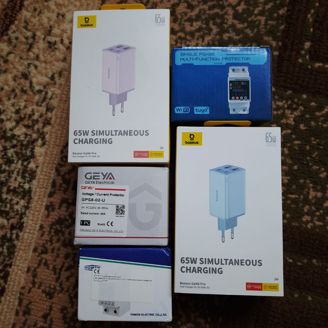 Зарядні пристрої Baseus Gan 6, реле напруги Geya, Tomzn