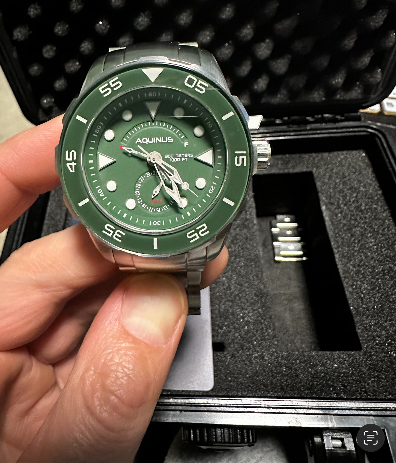 Aquinus Ruggada ASSASN5BSGR001 має матовий сріблясто-зелений циферблат, матові сріблясті індекси та стрілки з білим люмінесцентним покриттям. Круглий матовий корпус виготовлений із нержавіючої сталі, а матовий зелений скляний безель із швейцарським суперлюмінесцентним покриттям. Він має матову сріблясту головку, гелієвий випускний клапан і триланковий браслет з нержавіючої сталі. Він оснащений автоматичним механізмом NE57.