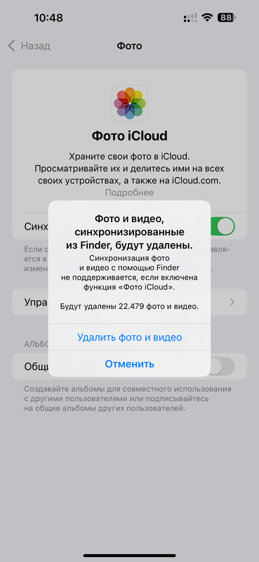 добавил ребенка в семью и пытаюсь синхронизировать его медиатеку с облаком, чтобы забекапилось. при попытке включения опции Фото iCloud, получаю такое окошко. я правильно понимаю, что это все будет полностью удалено, или как? и как сохранить тогда?