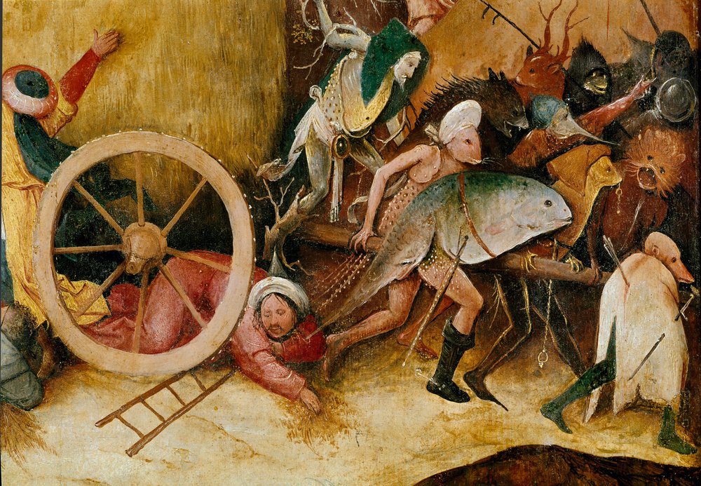 не можу згадати картину, здається Босх, але не впевнений. От що пам"ятаю на ній, це один з персонажів, напів-риба, напів-людина. Верх - риба, на людських ногах. Ну і там ще до біса екземплярів, дивокуватих. А от хто з авторів - вже не згадую. Все, що гугл показав по Босху, передивився, але такого персонажу не побачив.