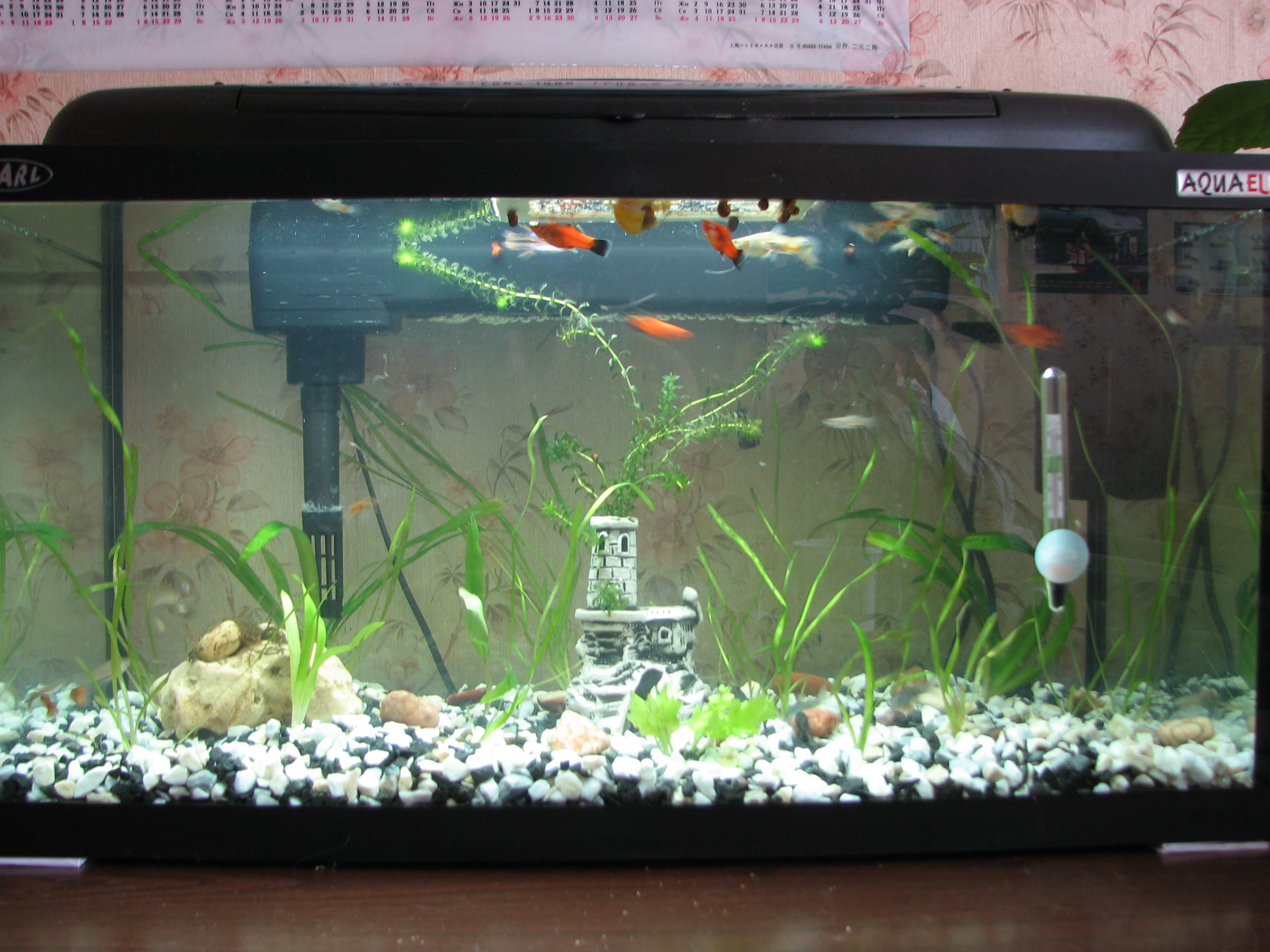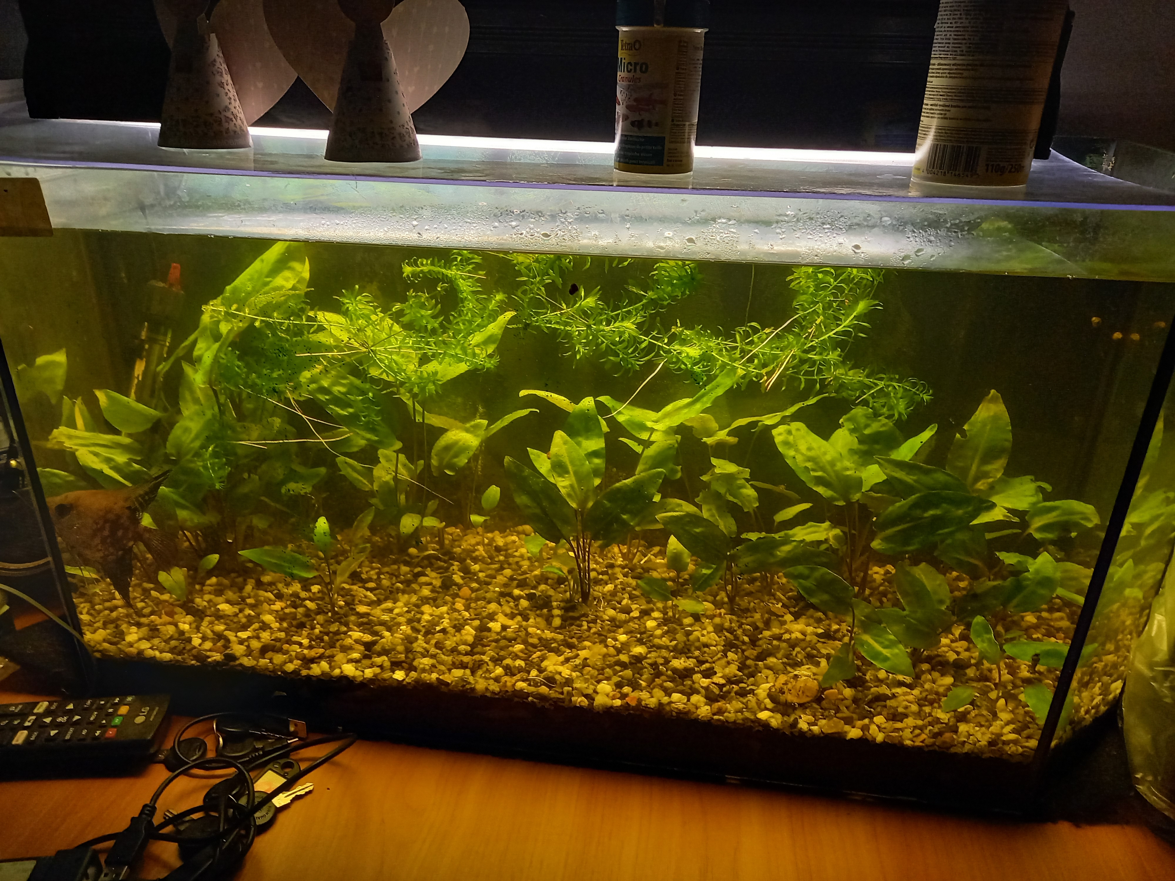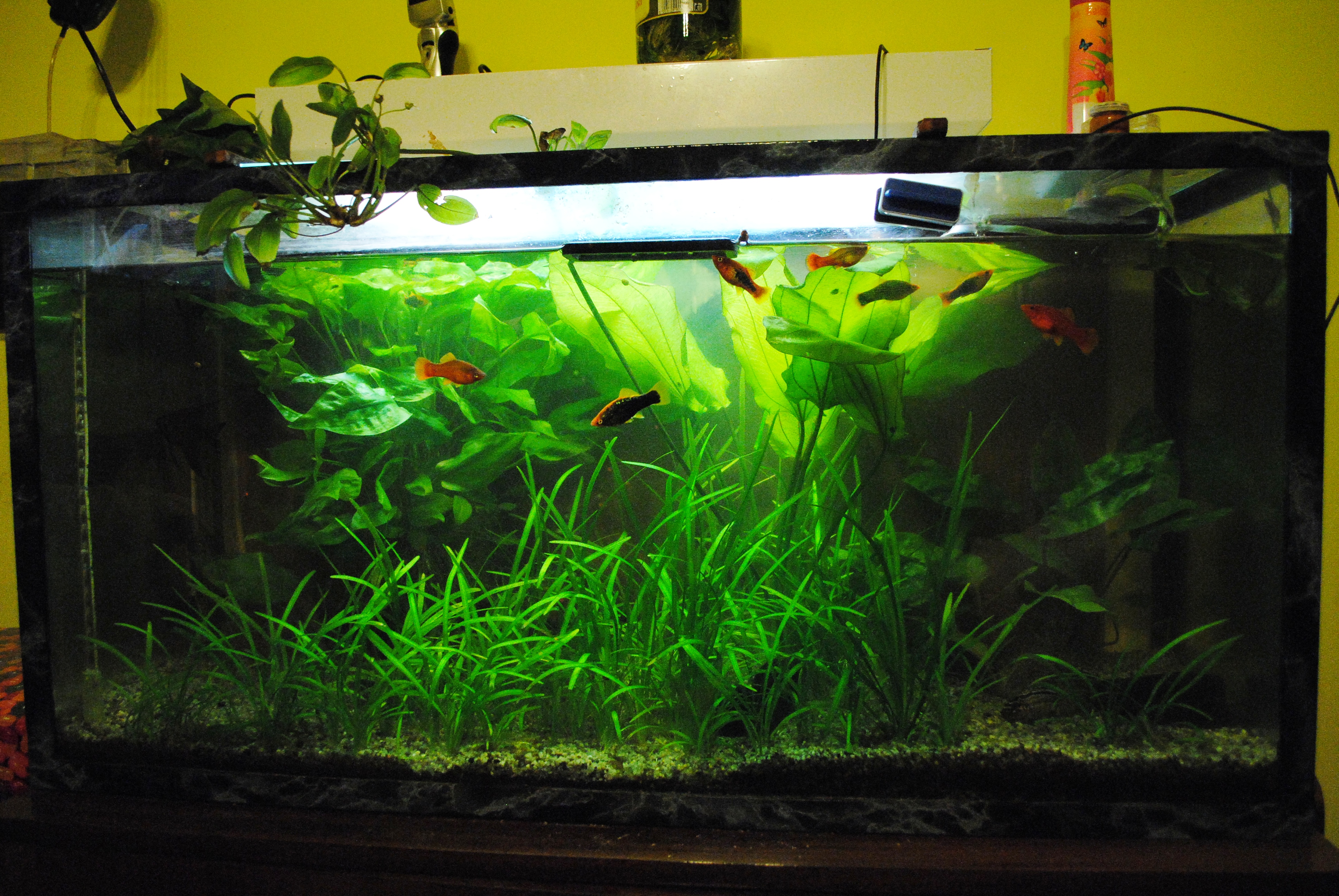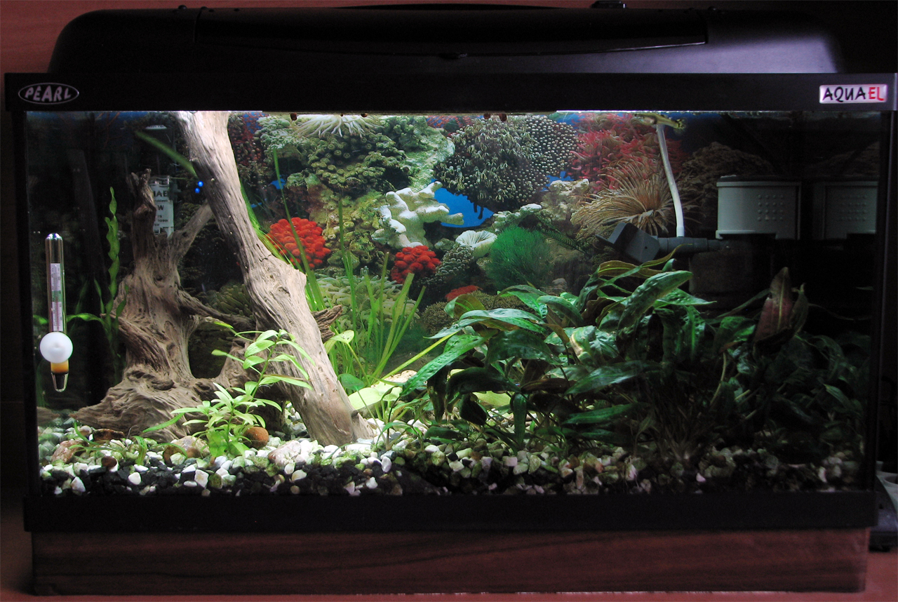 Ото понаписували... добре, шо перед сєкасом не питав тут поради Аматорський досвід - 40+ Ну, тобто з народження вдома була якась кількість акваріуімів, навіть підторговувалося приплодом як риб так і рослин, но в конкурсах не брали участі. Ось фото баночки в 70л, яка вже років 10 не перезапускалася, напевно. Стоїть собі в офісі на мому столі. Раз в місяць сціджується 3 літри води і доливається 6. Заодно і прополюється і викидається половину криптокорин, бо офроїд для риб вже робиться Ніяких таймерів, спеціальних ламп, фільтрів - ніхрена нема. Ну, грілка. Без неї ніяк. На вихідних ващє тупо природнє освітлення. Основне правило - не перенаселити риб, і не виставити на підвіконник, щоб не позеленіла вода. Все. Крапка. Решту сама природа стягне. Ну і якшо є де взяти пару літрів старої води з нормальної банки і десяток меланій - ващє жир.