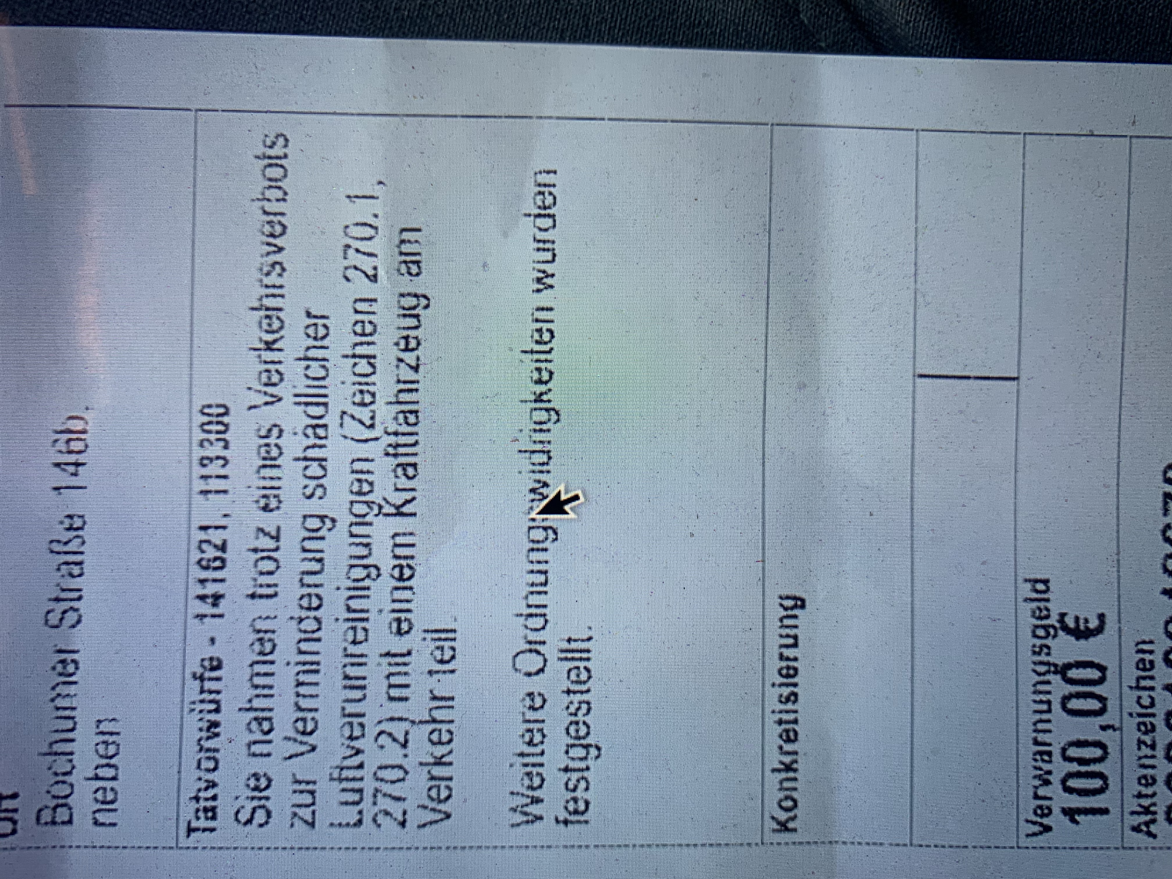честно говоря, я вообще не понял, за что штраф. Перевел тикет- там какая-то хрень про "участие в движении, несмотря на запрет движения в целях загрязнения воздуха". По улице ездит куча машин, как всегда. Я встал на место только что отъехавшей машины, паркоматов нет, рядом стояли машины без квитанций о парковке, знаков запрета на стоянку нет. Отсутствовал ровно 5 минут. Показал местным- они такое первый раз видят. кто-то мне сказал, что начали "на дурака" выписывать штрафы. Еще и 100 евро сразу влепили. Машина не дизельная Короче квест какой-то. Завтра еще раз съезжу, посмотрю, может я чего-то не заметил. Платить неизвестно за что точно теперь не буду. Может кто силен, растолкуйте плз.