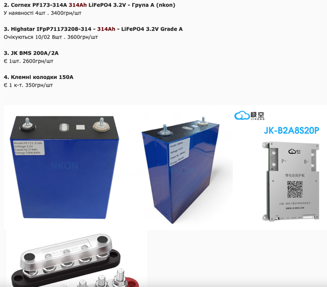 Наступного тижня будуть такі комірки: Highstar IFpP71173208-314 - 314Ah - LiFePO4 3.2V Grade A [зображення]https://ibb.co/S7PZg9wx[/зображення]