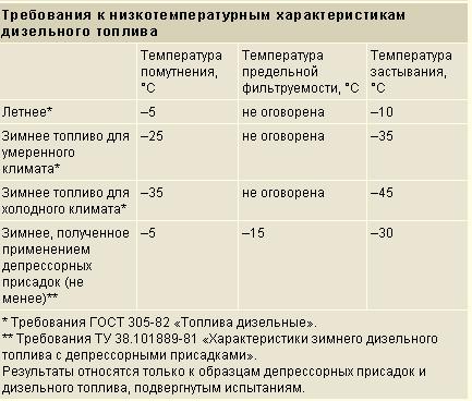 Может дело в том, что на АЗС соляра находится в больших обьемах и еще под землей, поэтому тока мутнеет. А в машине в баке под машиной, продуваемом всеми ветрами. Ну если влом смотреть.. вот тебе табличка.
