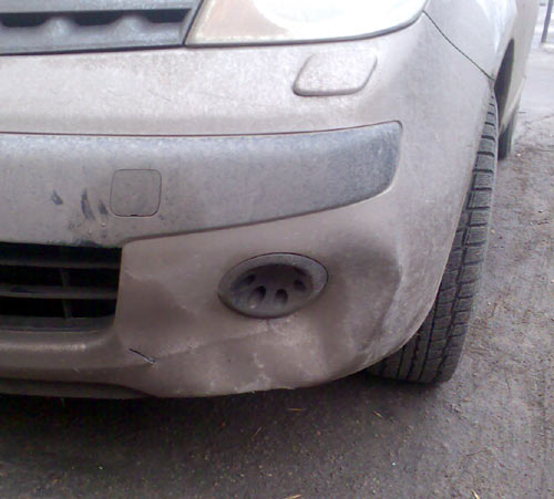 Сотруднику под колеса бросилась собака. Увернуться не успел и принял ее левой частью бампера. Собака как ни в чем не бывало удрала восвояси, но вот бамперу досталось. Машина Nissan Note. Есть мысли как бампер сделать? желательно побюджетнее. Фото прилагаю.