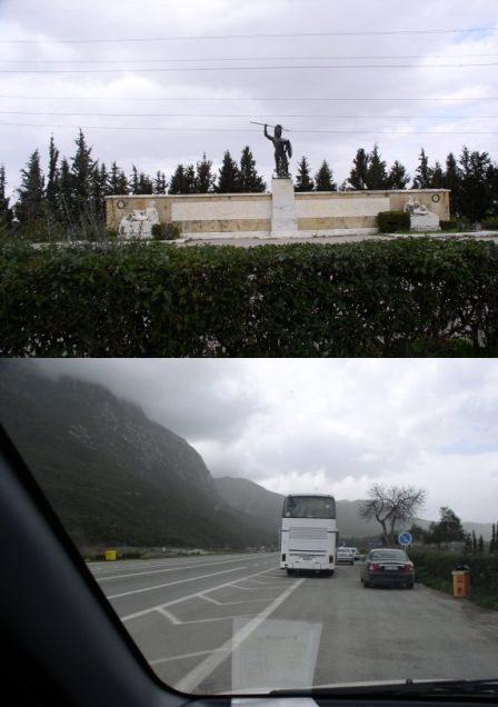 Это Термопилы. Место битвы 300 спартанцев с персами. На 1-ом фото памятник в честь этого события. В центре - Леонидас. За ним растут якобы 300 кипарисов. На 2-ом фото просто кусок трассы у памятника. Шел дождь, неохота вылазить из машины. Место находится примерно в 200 км от Афин по дороге на Салоники. Название произошло от имеющихся впереди термальных сероводородных источников. Вытекают мощным потоком из гор. Можно посидеть под водопадом. Запашок соответствующий.