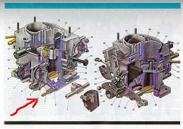 На рисунке указан стрелкой, забивается обычно канал, который идет от штуцера к диффузору, я бычно прочищал его 20-ти кубовым мед. шприцом и растворителем.