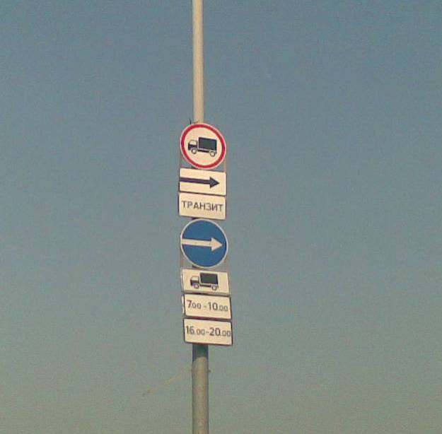 И всё же - с точки зрения выполнения ПДД каковы должны быть действия водителя грузового автомобиля? Верхний знак совместно с табличками двумя ВСЕГДА запрещает движение транзитных грузовых автомобилей направо, а нижний говорит о том, что в определённое время им следует ехать направо. Это коллизия или я не понимаю чего-то? И ещё - если всё-таки коллизия, т.е. знаки установлены неверно и не дают возможность однозначно трактовать их водителю грузового автомобиля - не даёт ли это ему право продолжать двигаться дальше по своему усмотрению?