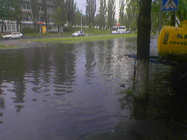 На Жукова, кварталом в сторону от этого места (спорт-интернат) упало дерево. Придавило какой то жип - вроде Сузуки. В это время был на Десне в Пуховке. Там 2 капли упало.... А тут еду смотрю деревья поваленые, озеро на Жидовке.....
