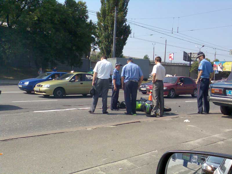 Сотрудник наш как раз видел саму аварию. Там присутствовал какой-то пешеход, которого этот мотоцикл пытался объехать. И их обоих снес жигуль! Причем жигуль остановился, но поразмыслив дал по газам и уехал.
