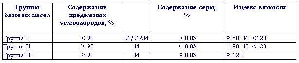 Группа I - базовые масла, которые получены методом селективной очистки и депарафинизации растворителями. Группа II - высокорафинированные базовые масла, с низким содержанием ароматических соединений и парафинов, с повышенной окислительной стабильностью (масла, прошедшие гидрообработку).