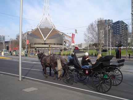 Причем, обратите внимание, что это одна из центральных магистралей (St.Kilda) c открытым движением транспорта. Более того, таких извозчиков довольно много.