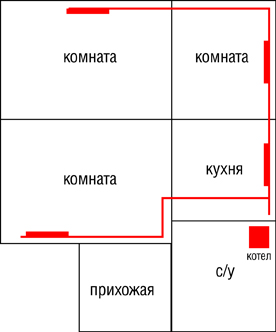 Вот. В прихожей, с/узле хотелось бы теплый пол (ну или батареи).Можно конечно и последовательно все замутить, но не будет ли последняя комната слишком холодной? По периметру - 9 х 9 приблизительно.