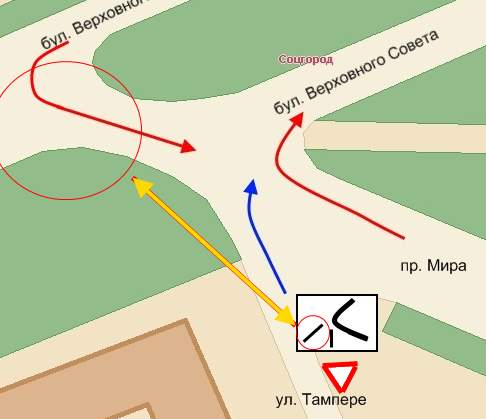 Съезд с бульвара достаточно широкий и визуально воспринимается как то-ли маленькая площадь, то-ли продолжение второстепенной дороги, которая левее - там немного наискосок дорога проложена. Вот это и смущало раньше - сейчас вроде разобрался, всем спасибо