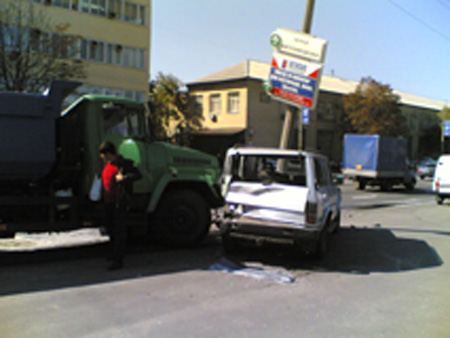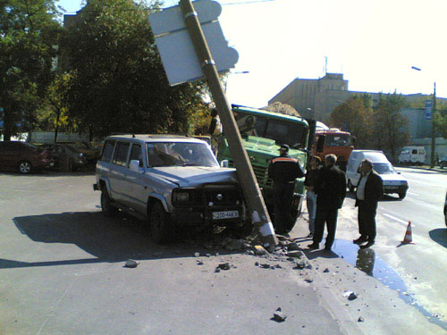 Иду я как-то по Автозаводской и вижу такую картинку . Смотрите фото. Ачуметь - передом снес бетонный столб, а сзади КрАЗ кусок кузова снес, а рама почти не пострадала, моща. Интересно, сколько баллов получила бы эта машинка на краш-тестах