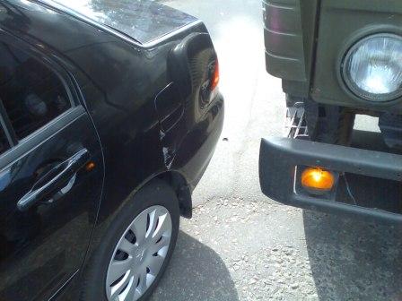 Пролог. Эх, получилось как в рекламе - не ты так тебя... Поворачивал направо с правого ряда. Со второго ряда, тоже направо поворачивал КАМАЗ. Водила камаза слишком сильно принял в право и ударил своим бампером мне в бочину. Удар был ощутимым, авто тряхнуло. Выходим. Водила частник, без ГО, с Житомирской области. Смотрю на свои повреждения. В левом крыле вмятина от бампера КАМАЗА глубиной 5-7 мм и шириной 15-20 см + глубокие царапины до металла. Позвонил на оф. СТО, обрисовал повреждения. Говорят нужно красить все крыло . Вместе с рихтовкой будет стоить около 2200-2500грн. Вызвали ГАИ. Протокол составлен на водилу камаза. Меня отпустили а с водилой камаза стали разбираться дальше.