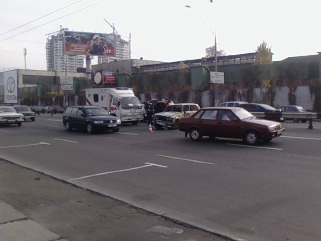 Причина - авария. Сразу за Шулявкой, нопротив танка. Перекрыто 2 левые полосы. как произошло не понятно, участники вишневая ВАЗ-2107 с синими номерами, и бежевая ВАЗ-2106. У милицейской машины нет передка. стоит ровно в крайней левой полосе, У "шестерки" разбит левый бок. Есть пострадавшие. Также был замечен мотострингер или как его там, те которые еще разкрашены в корпоративные цвета "билайн". намечаеться приличная. Гаи на 13-00 еще небыло.