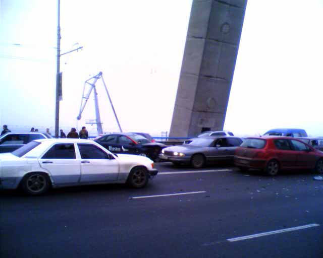 Прогулялся в ПДН на рыбалку. Находясь километрах в двух от моста, услышали кучу бумсов. Пока дошли до моста обнаружили грандиозную пробку в обе стороны, и кучу битых машин ровно в центре моста. Перед пробкой как обычно с этой стороны машины сразу выстроились в 8-9 рядов, оставив целый ряд для встречного потока. С другой стороны так же, только щедро оставлено почти два ряда. Реверс и один встречный ряд забиты поломавшимися машинами , мигающими аварийкой (видимо аварийка разрешает ехать по встречке?). Вобщем как обычно народ не разошелся на реверсе, заодно разлетаясь набили кучу машин. Несколько скорых, хотя думаю без тяжких. Потоки машин протискиваются среди битья, при этом смело хрустя кусками отлетевших бамперов и фар.