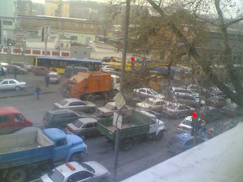 Мне повезло - я стоял там всего где-то минут 20-30, потом проехал. Дальше по межигорской еще какие-то два дятла, один на газоне, второй на пирожке умудрились побившись стать поперек дороги и занять еще 2 полосы