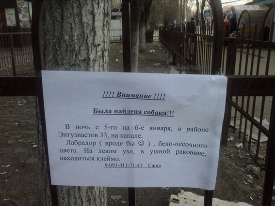 Подхватила инициативу - разместила тут http://forum.doggy.kiev.ua/viewtopic.php?p=238930#238930 и в сообществах нескольких в ЖЖ фото с этим объявлением. Форумчане - если можете - покидайте по инету - давайте сделаем доброе дело и поможем зверику найти хозяев! vvlaw