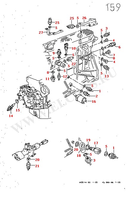 машина 88 года, мотор RT 5 цилиндров KE-Jetroniс. лампочкой чек намигало траблы с датчиком температуры (2-3-1-2).. на моторе их было обнаружено аж 5 штук вроде несколько классифицировал как термовыключатели: первый на радиаторе (должен быть трёхконтактным, стоит двухконтактный - в принципе машина не перегревается, не напрягает). хотя кажеться сразу сильношумный режим включается - к лету надо на нормальный поменять. второй на кронштейне с торца блока возле последнего цилиндра (№25 на картинке) - это похоже дополнение к датчику в радиаторе - для работы вентилятора после выключения зажигания, он же может выполнять функцию включателя второй скорости). остались датчики вроде №10 b 034906161 температурный датчик для машин с регулируемым катализатором 2 контакта чёрный M10X1 RT,NF №11 b 034919369C температурный датчик -/118C M14X1,5 4 контакта RT,MC,CN,NC, NF №6 034906163 термовременной переключатель 15C M14X1,5 2 контакта коричневый RT,KU (судя цвету проводов - это переключатель связан с пусковой форсункой и похоже определяет время её работы - там график указывает что в зависимости от температуры форсунка начинает работу с определенного времени и определенно время работает).
