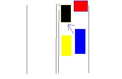 Ул. Дегтяревская, вечер. Еду от Берестейки с сторону Телиги. Еду (желты) за Волгой (черная), впереди стоит машина (красная). Справа летит бХА новая тройка, начинает подрезать, я на сигнал, в ответ он просто идет на таран мне в бочину и выпихивает на встречку. Дальше пропушу его вытормаживания в пол "учение" и т.д. Кста, до Волги у меня расстояние метра полтора, т.е. никак машина не влезла бы. Вопрос кто был бы виноват, если бы я не вывернул а тупо подставил свой бок?