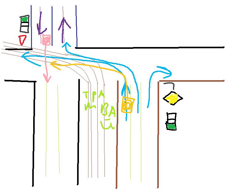 Вот я об этом идиотском перекрестке и говорил.... при работающих светофорах оранжевая машина пропускает розову...в общем пробка в этом месте обеспечена...