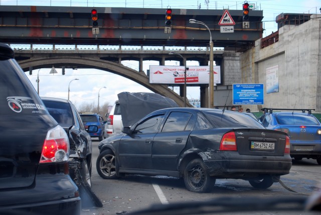 непонятно, что произошло, но побиты 3 машины (те, что я увидел): вектра, слева от нее (не запомнил марку) и справа у обочины бусик с выбитым левым передним колесом. тянучка была некислая - сто метров до светофора за полчаса.