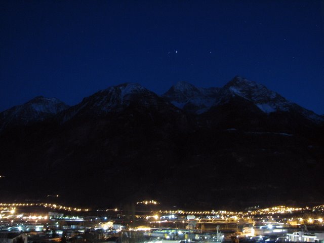 Спускаться с этого склона пришлось хотя и по красной трассе, но ширина ее была метра 2 над обрывом... За все надо платить. Объехали опять все склоны. Много детских школ, очень уютно, по-семейному. Хорошие рестораны, собираются компании на праздники, кухня отличная... До гостиницы совсем близко. Кстати, вот так красиво было из номера
