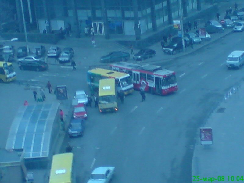 ага! маршрутка маршрутку, а троллейбус стоит с аварийкой, потому как пытаясь объехать эту "кучу малу" у него сорвало рога с проводов, а может и он участвует в ДТП.