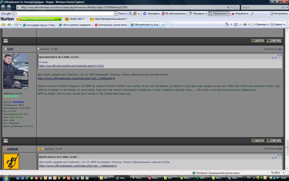 Виталик, ты не участвовал в операции по поиску отца Пашки. Операция длилась две недели. Самое деятельное участие в ней принимали друзья Пашки и ребята из тусовки УА-Оффроад. Клуб оффроадмастер принимал участие только в первый и немного во второй день. Именно потому что клуб иногда действует по человечески в ситуации с блокиратором Паша по моей просьбе позвонил Госу. Но как всегда личности стоящие у руля показали свое лицо, и ты тоже здесь засветился - наврал явно и откровенно и начал метать бисер. Я командовал этой операцией, и писал рапорт о ней в милиции. Я не приуменьшаю помощь клуба ОФРМ, но с твоей стороны кичиться этим - моветон. Вобщем чисто по человечески - ты не прав. Если ты этого не понимаешь - мне тебя жаль.