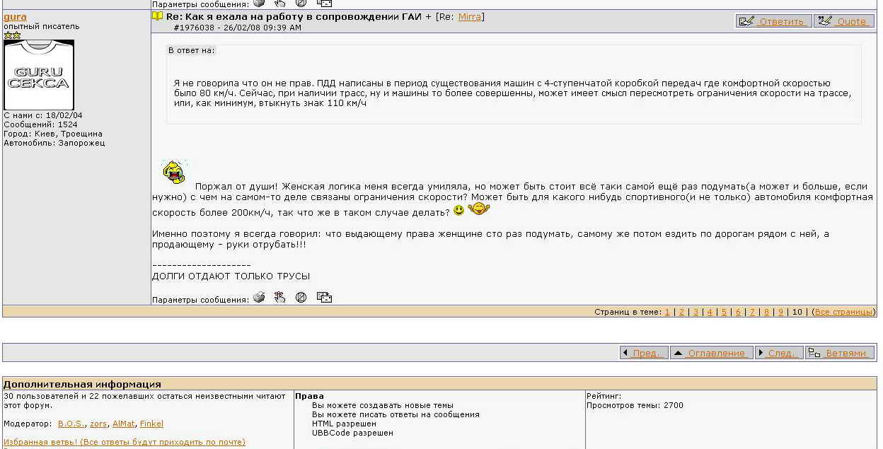 Обновляю центральную доску форума и вижу, что кто то поднял старую тему в которой Мира пыталась познакомится с гайцем открываю тему и вижу, что последнее сообщение было 26,02,08. глюки какие то