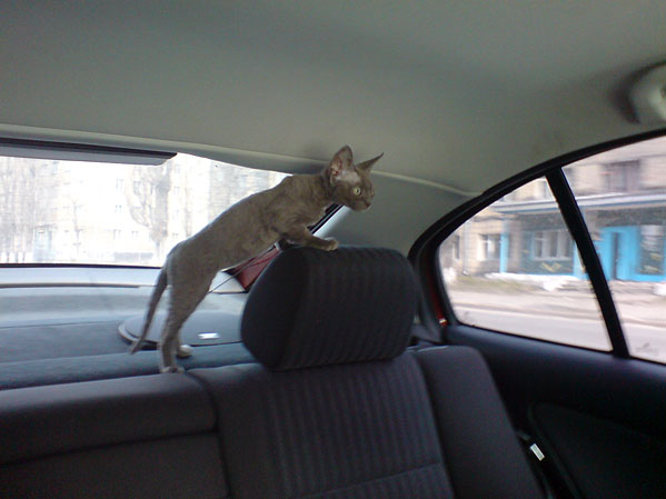 Нормально так мой кот, пока был небольшой, тоже на плече располагался и вперед смотрел - потом, когда потяжелел, уже располагался на полочке над перчаточным ящиком но тоже впередсмотрящим , пока не засыпал. А еще он пытается охотиться на обгоняемые попутные автомобили и грузовики, особенно в темное время суток, когда видны одни фары, и дорожные указатели