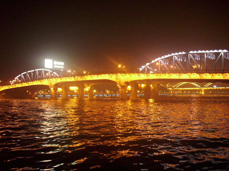 Сам город вечером выглядит даже лучше,чем днем - не видно трущоб и пробок Да и рестораны весьма неплохи.Один из самых известных - прямо на набережной,4 этажа и очереди у входа. В меню суши и сашими Свежие крокодилы и крабы и национальные блюда -черепахи и лобстеры Поесть вдвоем с пивом обошлось нам в 550 юаней - это около 80 долларов,недорого,как для свежайших креветок и сашими. В принципе выпить можно и не только пива - в меню целая страница отведена местной водке Но пить ее мы не рискнули Хотя и закуска была недорогая,колбаска,так сказать,местная