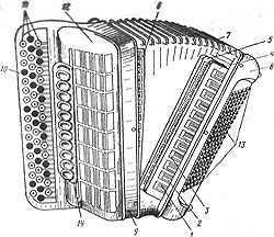 Иной разновидностью баянов являются оркестровые баяны (пикколо, альт, прима, тенор, бас, контрабас), которые применяяются в оркестрах баянистов. В связи с широким развитием в нашей стране художественной самодеятельности спрос на оркестровые баяны (особенно в последнее время) сильно возрастает. Основным видом хроматической гармони, выпускаемой промышленностью в настоящее время, является трехрядный двухголосный баян с 52-61 кнопками (пуговицами) в мелодии и 100- 120 кнопками в готовом аккомпанементе (рис. 2). Конструкция этого баяна еще недостаточно совершенна и в известной мере сковывает исполнительское мастерство, а также препятствует полному использованию потенциальных возможностей инструмента. Перед промышленностью стоит задача организовать массовый выпуск таких баянов более совершенной конструкции.