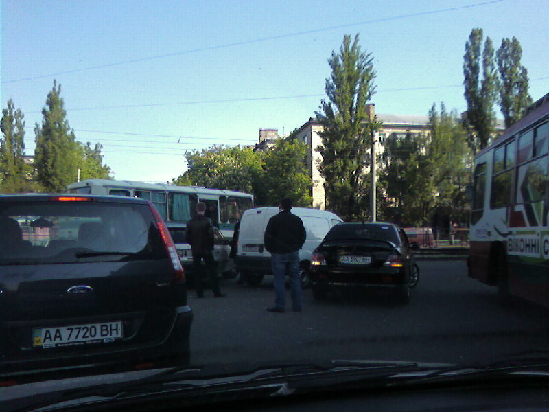 08:55 - троллейбусы стоят с аварийкой в правом ряду вплоть до выезда на Борщаговскую. Дальше картина следующая (см. фото). Авария - три автомоблиля. С нескольких попыток протискивается автобус. Одна полоса все таки остается свободной