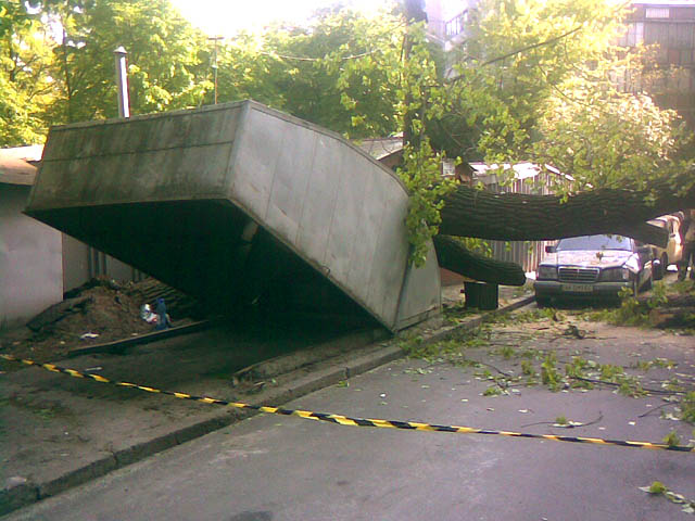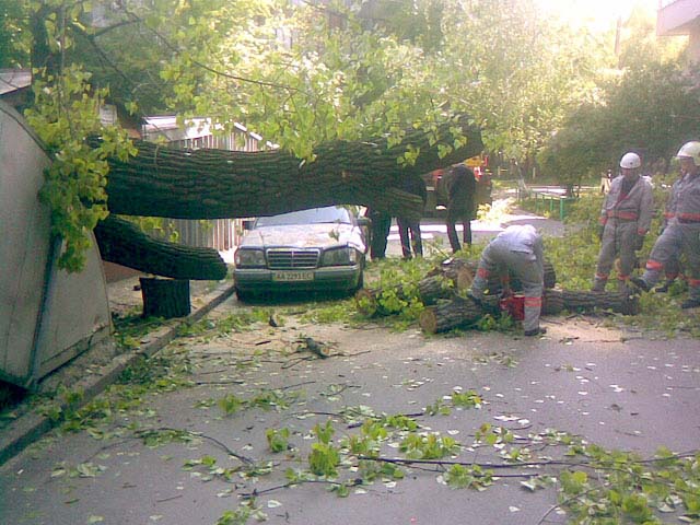 Пришлось сегодня ехать на работу на такси. Выезд со двора заблокировало упавшее дерево. Пострадало три машины. Мерс - больше всего, дерево лежало на капоте, на фото - уже подняли. Вот так бывает: ни грозы, ни ветра - а упало. Интересно, несет ли какую-то ответственность Киевозеленение (или как там оно называется?). Смогут ли водители получить какое-то возмещение, если нет страховки?