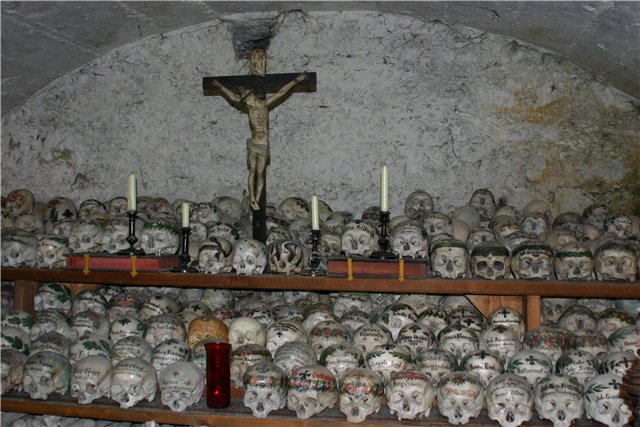Одна местная бабушка померла году этак где-то 77-м. Завещала, чтобы, по хальштаттской традиции, череп через 30 лет откопали, разукрасили и оставили храниться в часовне. Вон он и лежит там, в самом центре под крестом, с золотым зубом.
