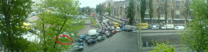 только что с балкона своего сфотал панорамой (немного неровно наложил 1 и 2 кадр). в красном круге - притёрлись Рав4 и Жигулики.