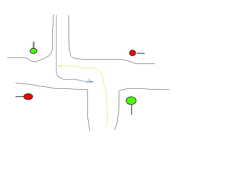 Приведу пример, когда на свой зеленый нужно притормаживать и смотреть. Ужгород, перекресток ул. Собранецкая и Закарпатская+Докучаева (возле магазина Дастор). Для желтой и синей стрелок горят зеленые. Направление указано. Схема на рисунке. Не все знают правило "Помеха справа".