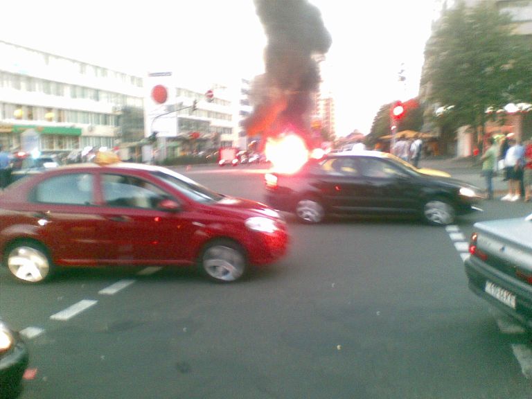 Ехал щас примерно в 21-45 по бул. Леси Украинки из центра и на перекрестке с Щорса в полоборота мордой в сторону Щорса стояла типа машина, какой-то универсал, не разобрал какой. Не было всех стекол, сильно покореженный, частично черный - видимо горел. Вокруг рабочие заметали и лопатой скоблили асфальт. Все тормозили на перекрестке, глазели, тянучка образовалась почти от Бессарабки.