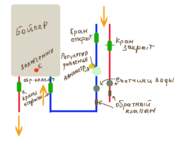 У нас дома стоит бойлер на 50л. трубочка с клапана бойлера засунута в 2х литровую бутылку, за 1 год ежедневной эксплуатации бутылка всё время пустая И ещё по схеме странно получается, если бойлер не включен то давление на манометре постоянно 3атм, а если бойлер включить то возростает до 6атм., каким образом ведь по трубам от бойлера до манометра стоит 2 клапана (один возле счётчика и второй возле крана бойлера), и манометр должен работать тлько в одну сторону, а получается что он типа суммирует давление системы и давление из бойлера, причём из бойлера оно как-то просочилось через обратные клапана.